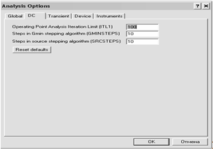 Convlimit - включение или выключение дополнительных средств для обеспечения сходимости итерационного процесса (например, за счет использования метода вариации напряжений источников питания;