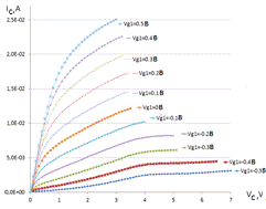 Для измерения статических характеристик был использован прибор Keytley 2400. Он позволяет одновременно подавать и снимать напряжение и ток с двух каналов. Генератор постоянного тока был подключен ко второму затвору и подавал напряжение 4 В на затвор 2. Сток-затворная и выходная характеристики представлены на рисунках 2.4.2 и 2.4.3 соответственно.