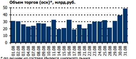 В прошедшем месяце большинство ключевых секторов экономики, представленных на российском фондовом рынке, показало положительную динамику. Лидером роста стал телекоммуникационный сектор: повышение по отраслевому индексу составило 9,87%. Также существенное увеличение продемонстрировали электроэнергетический и потребительский секторы - Индекс электроэнергетики вырос на 9,05%, а Индекс потребительского сектора прибавил в весе 7,36%. Падение было отмечено в транспортном секторе - Индекс транспорта упал на 3,54%. Индекс голубых фишек вырос на 5,44% до 13 016,65 пунктов (12 345,46 пунктов на 31 июля 2017г.). Индекс второго эшелона вырос на 5,11% до 6 992,63 пунктов (6 652,52 пунктов на 31 июля 2017г.). Индекс широкого рынка прибавил в весе 5,38% и составил 1 446,44 пунктов (1 372,65 пунктов на 31 июля 2017г.).