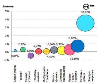 На нефтегазовый сектор приходится 43,84% суммарной капитализации Индекса ММВБ. Среди остальных отраслей выделяются финансы (вес в индексе 22,66%) и металлургия (14,03%).