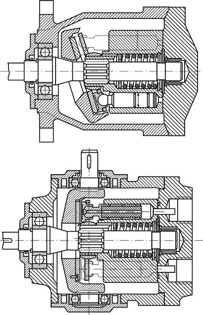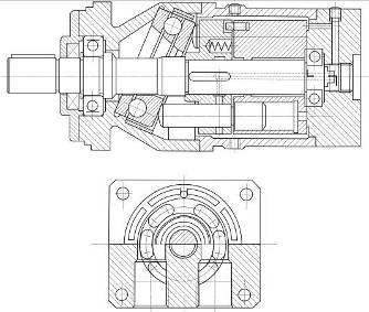 В конструкции гидромоторов однако можно заметить некоторые отличия от соответствующих роторных насосов, обусловленные различным функциональным назначением этих гидромашин. В аксиально-поршневых гидромоторах устанавливается угол наклона блока цилиндров (до 40˚) больший, чем у таких же насосов (до 30°).