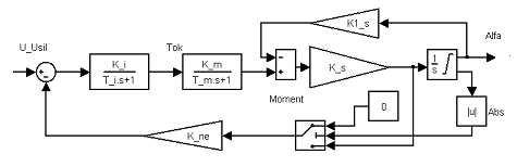 В данной схеме противо ЭДС учитывается обратной связью по скорости с коэффициентом К_пе. Более правильно было бы учитывать противо ЭДС по координате, однако, в этом случае в обратной связи появляется дифференцирующее звено. Чтобы избавиться от него обратная связь идёт от скорости. В данном случае появляется новая проблема: в то время когда гидрораспределитель ложится на упоре и угол становится константой, скорость не равна нулю. Чтобы этого избежать, в обратную связь в модели встраиваем звено - “ключ”, которое в обратной связи обнуляет скорость в момент, когда гидрораспределитель ложится на упор, т.е. на интеграторе с ограничением достигается насыщение. Данная модель наиболее полно соответствует реальной модели нашей системы.