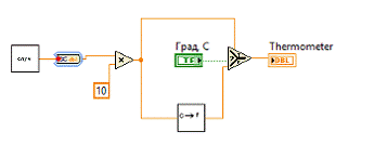 его на блок-диаграмму. Этот ВП переведет градусы Цельсия в градусы Фаренгейта.