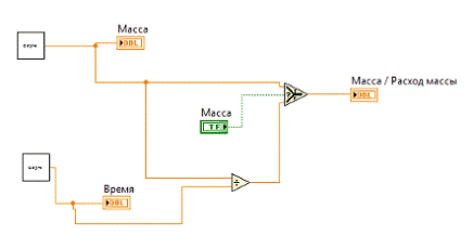 ВП измеряет значения массы и времени и отображает расход массы |