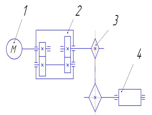 - электродвигатель; 2 - редуктор; 3 - цепная передача; 4 - ролик