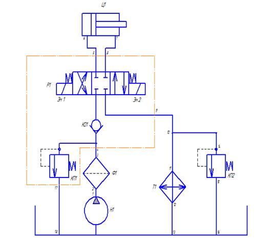 гидроцилиндр; Н1 - насос; Ф1 - фильтр; КП2 - клапан предохранительный; Р1 -