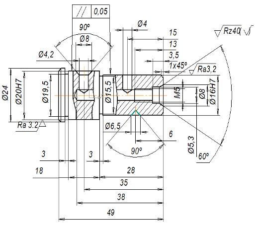 . Контролировать размеры: Ø 16,5Н7, Ø20Н7, Ø19,5; Ø15,5-0,2, Ø 4,2, отв. М5; линейные размеры: 49, 28, 38, 35,13, 16; 18, 3, 5.