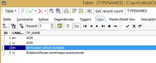 Таблица TYPENAMES, в поле TP_NAME создать две новые строки «All-Russian school olympiad» для английского языка (en) и «Всероссийская олимпиада школьников» для русского языка (ru).