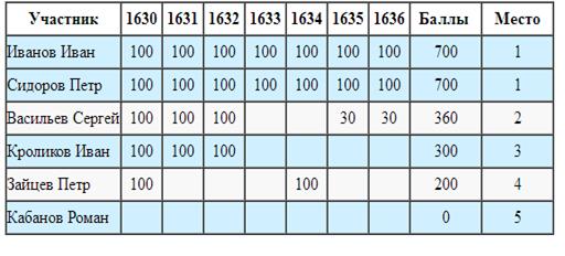 Программа считывает эти файлы и инициализирует внутренние переменные, после этого программа делает запрос к базе данных по идентификатору задачи и идентификатору участника олимпиады, на получение количества баллов у всех школьников. На основании полученных данных формируется и выводится турнирная таблица в формате html. В таблице указаны имена участников, номера олимпиадных задач, количество набранных баллов за эти задачи, суммарное количество баллов и места в турнирной таблице. Код программы показан в Приложении 2.