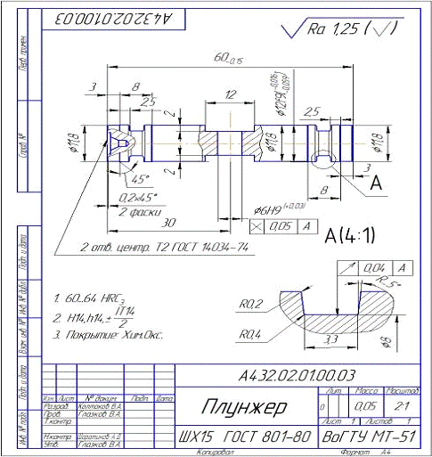 Плунжер изготавливается из стали ШХ15 ГОСТ 801-80 , пруток ГОСТ 7417-88. Для предохранения от коррозии деталь проходит термическую обработку, в качестве которой предусмотрено оксидирование, т. е. насыщение поверхности детали кислородом.