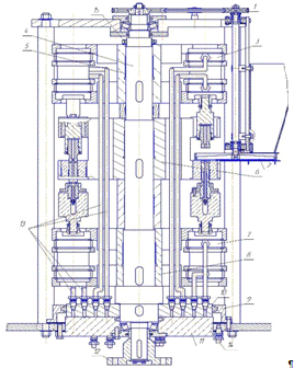 гидроцилиндр; 8 - барабан нижний; 9 - стакан; 10 -диск; 11 - торцовый