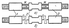 а - жесткой, б - гибкой; 1, 2, 3 - станки; Ж - жесткая связь, Г - гибкая