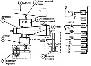 Копировально-измерительный прибор (КИП) имеет жесткую связь с суппортом (6), который вместе с резцом (3) управляется ведущей передачей (4) и следящей передачей (5).
