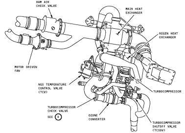 Чтобы добиться этого, первый температурный датчик измеряет температуру воздуха ниже по потоку от теплообменника. Этот температурный датчик передает ECU системы OBIGGS отклонение от заданного значения температуры на входе в ASM для обеспечения оптимальной температуры воздушного потока. Функция оценки отклонения значения температуры не зависит от функции отключения системы OBIGGS при её перегреве. Теплообменник понижает температуру воздуха до 210F (99 градусов Цельсия). Турбокомпрессор сжимает отбираемый перед подачей его в блок разделения воздуха. Турбокомпрессор состоит из вала, и двух крыльчаток. Когда блок управления посылает сигнал на клапан турбокомпрессора, клапан открывается и отбираемый воздух раскручивает входную часть турбины. Отбираемый воздух всасывается через выходную часть турбины. Мощность турбины используется для приведения в действие компрессор. Воздух на выходе из турбины охлаждается за счет разрешения и помощи воздухо воздушного радиатора.