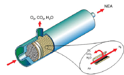Сжатый воздух, поступающий Air Separation Module, состоит из 78 процентов азота, 21процентов кислорода, и одного процента микроэлементов. Воздух на входе в модуль поступает в полую часть волокон, через стенки волокон проходит только кислород, азот пройти не может, в результате чего воздух, выходящий из дальнего конца модуля, состоит из 99.9 процентов азота. Воздух, содержащий кислород не прошедший через модуль выбрасывается за борт.