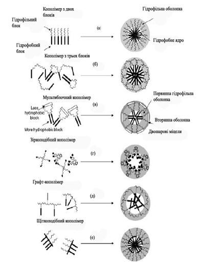 У водних розчинах завжди сферичні міцели формуються само-агрегацією амфіфільного ди-блоку типу АВ або три-блоку типу АВС,коли довжина одного гідрофільного блоку перевищує в деякій мірі довжину гідрофобного блоку. Але, якщо довжина гідрофільного блоку занадто велика, кополімери знаходяться у воді як індивідуальні молекули (мономери) ,і молекули з розтягнутими гідрофобними блоками утворюють різні структури. Приклади різних амфіфільних кополімерів ,що були досліджені для утворення міцел показані у Таблиці 2.