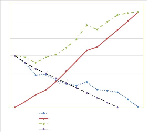 В Agile после завершения работы командой в итерации (спринте) может выполняться перепланирование с учетом появления новых требований в бэклоге продукта со стороны PO. Диаграммы сгорания / выгорания по проекту в целом могут показывать, что в ходе выполнения проекта количество требований растет рис. 16 [15]. Линия сгорания остающихся свойств показывает, что темп завершения меняется каждый раз при добавлении новых свойств в проект.