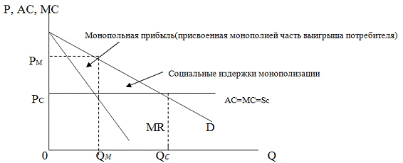 Монополизация конкурентного рынка приводит снижению объема продаж с QC до QM и повышению цены с P C до PM. При этом часть выигрыша потребителей присваивается монополией, а часть безвозвратно утрачивается.