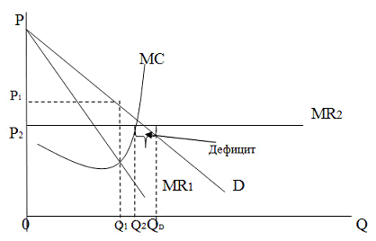 При установлении верхнего предела цены p2 монополия воспринимает ее, как предельный доход. Обеспечивая равенство предельного дохода и предельных издержек, монополия увеличивает продажи с Q1 до Q2. Поскольку при цене p2 величина рыночного спроса составляет QD, на рынке возникает дефицит (QD-Q2).