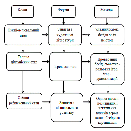 ІІ етап - творчо-діяльнісний. Цей етап включав в себе проведення бесід, сюжетно-рольових ігор, занять з художньо-естетичного розвитку, ігри-драматизації відомих казок.