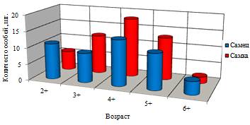 Самое маленькое количество самок в этой выборке можно увидеть в трехлетнем (6 шт.) и семилетнем (2 шт.) возрасте. А у самцов самое маленькое количество особей наблюдается в семилетнем возрасте (4 шт.), что связано с маленькой выборкой данной возрастной группы.