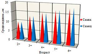 На рисунке 9 показан график изменения длины самцов и самок с возрастом. Во всех возрастных группах средняя длина самцов и самок не сильно отличается друг от друга.