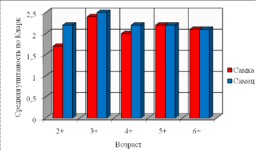 В двух возрастных группах (5+, 6+) упитанность между самцами и самками равная. Во всех остальных возрастных группах упитанность самок ниже, чем у самцов. Это связано с более энергозатратной подготовкой гонад к первому и последующим нерестом.