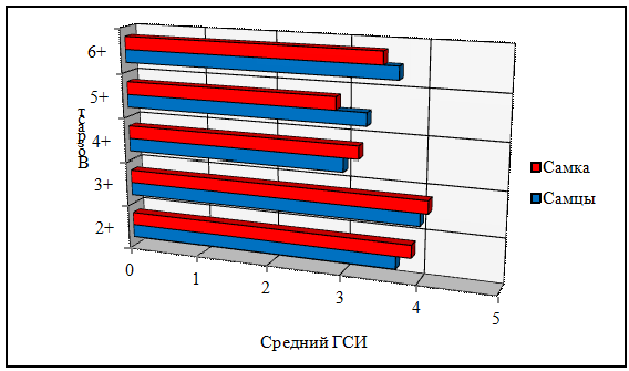 Средний ГСИ у самок меньше в двух возрастных группах (шестилеток и семилеток).