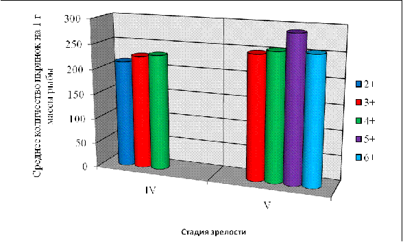 В данной выборке присутствуют две стадии зрелости: IV и V. IV стадия зрелости присутствует толь ко в трех возрастных группах (2+; 3+; 4+) и самое большое количество икринок на 1 г тела рыбы приходится на пятилеток в IV стадии зрелости. На V стадии зрелости самое большое количество икринок 289,9 шт. принадлежит шестилеткам. Что говорит о хорошем развитии половых гонад, но не больших размерах самих самок.