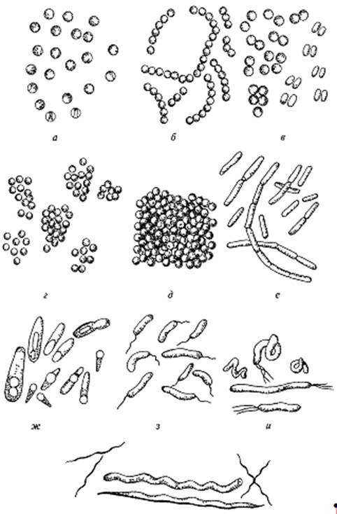 в - диплококки, г - стафилококки, д - сарцины; палочковые: е - бактерии, ж -