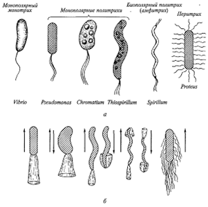 Рис. 4. Основные типы расположения жгутиков (а) и типы движения бактерий (б)