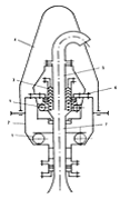1 - переходник; 2 - шарик; 3 - пята; 4 - резиновое кольцо; 5 - шток; 6 - пружина; 7 - корпус; 8 - плоские пружины; 9 - ось; 10 - резцы; 11 - прокладки.