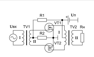 Принципиальная схема двухтактного усилительного каскада с трансформаторами и полевыми МДП-транзисторами n-типа, включѐнными по схеме с общим истоком, дана на рис. 11.6.