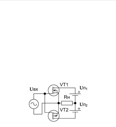 дет открыт, и ток потечѐт по цепи от плюса источника питания Uп2, по нагрузке, исток-сток транзистора VT2, к отрицательному полюсу источника питания Uп2. Поступление на вход сигнала с напряжением то положительной, то отрицательной полярностей приводит то к запиранию одного транзистора и отпиранию другого, то наоборот. Другими словами, транзисторы функционируют в противофазе. Транзисторы VT1 и VT2 выбирают так, чтобы их параметры и характеристики в рабочей области были как можно более близкими.
