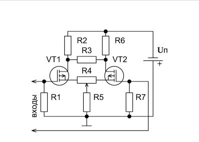 Если на один из входов, например, между затвором и истоком транзистора VT1, подадим более высокое отпирающее напряжение, чем на другой вход, то ток стока транзистора VT1 возрастѐт, а ток стока транзистора VT2 станет, наоборот, меньше из-за того, что протекающий по резистору R5 ток неизменен.