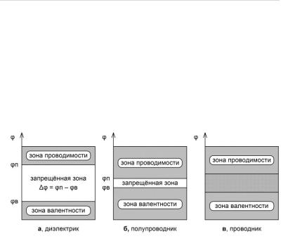 ствует диэлектрикам, над буквой (б) – полупроводникам, а над буквой (в) – проводникам. По вертикальной оси отложена энергия электронов, а горизонтальная ось безразмерна. Между зонами проводимости и валентности диэлектриков большой незаполненный промежуток, и упорядоченное движение носителей заряда отсутствует. Между энергетическими зонами проводимости и валентности полупроводников расстояние не велико, и в зоне валентности допустимо появление дырок, а в зоне проводимости такого же числа электронов, что может обеспечить условия протекания тока. Между зонами проводимости и валентности расположена запрещѐнная зона. Энергетические зоны валентности и проводимости металлов