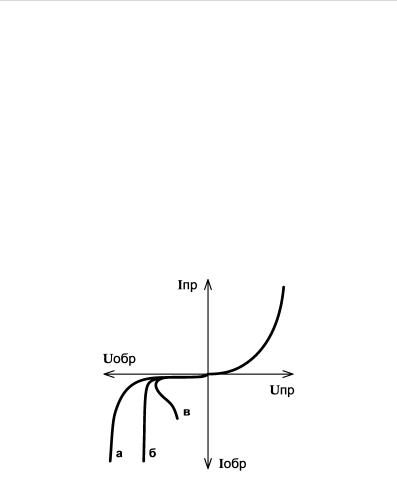 На вольтамперных характеристиках [44, с. 82] электроннодырочного перехода, показанных на рис. 2.2, лавинный пробой изображѐн на кривой (а), зенеровский пробой – на кривой (б), а тепловой пробой отражѐн в наличии участка отрицательного дифференциального сопротивления на кривой (в).