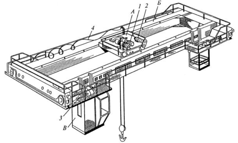 1 – Электропривод подъема лебедки; 2 – Электропривод передвижения тележки; 3 – Электроривод передвижения моста; 4 – Кабель питания электроприводов.