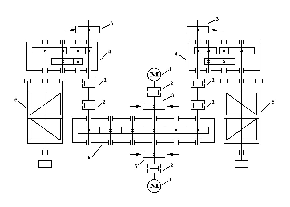 1- электродвигатели; 2- муфты; 3- тормозное устройство; 4- редукторы; 5- барабаны; 6- дифференциальное устройство