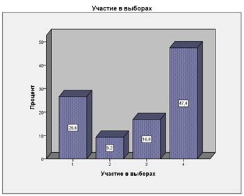 Молодые люди обладают низкой электоральной активностью: «не принимают участия в выборах» – 47,4%, «участвуют в политических выборах» – 26,6%, «в некоторых участвуют, в некоторых нет – из-за условий выборов» - 16,8%, «иногда принимают участие, когда есть свободное время» – 9,2% (Рис.3).