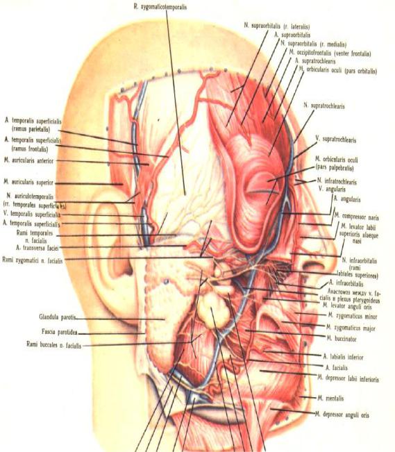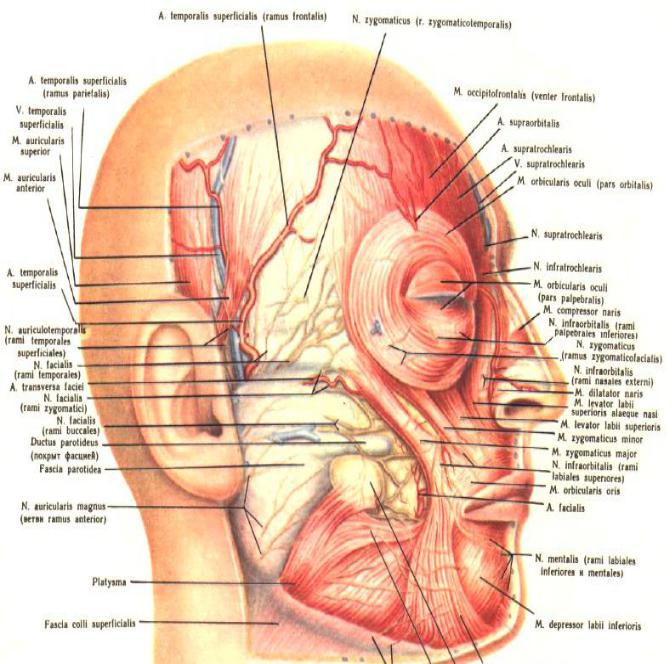 3.Над передней третью скуловой дуги в подкожной клетчатке поднимаются: к лобному брюшку – височные ветви, а круговой мышце глаза – скуловые ветви лицевого нерва