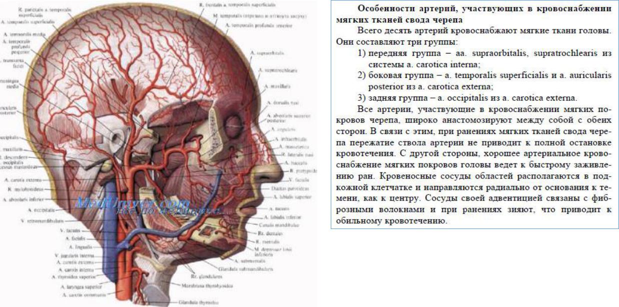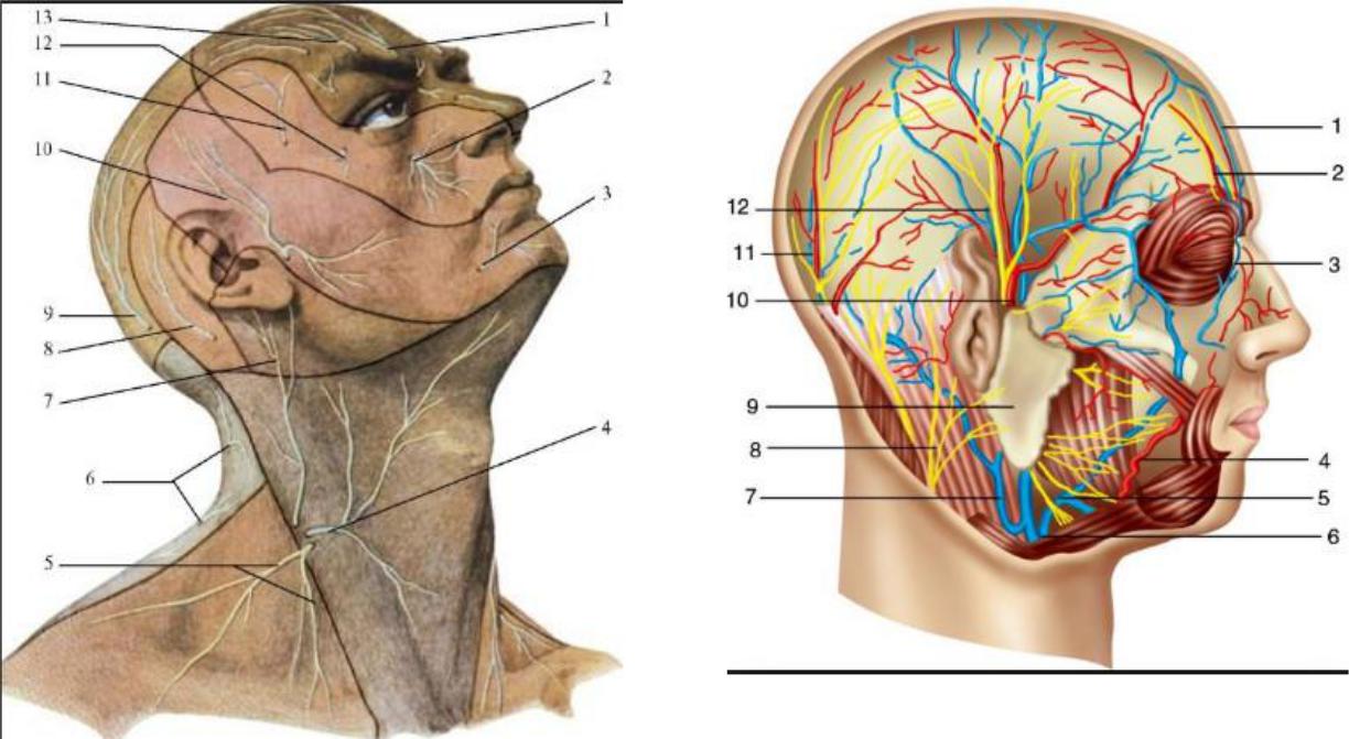 1.Поверхностные височные сосуды и ушновисочный нерв выходят из толщи околоушной железы и поднимаются прямо вверх впереди от козелка. На уровне наглазничного края сосуды и нерв делятся на лобные и теменные ветви. Лобная ветвь поверхностой височной артерии анастомозирует с надглазничной артерией, а теменная ветвь – с затылочной артерией.