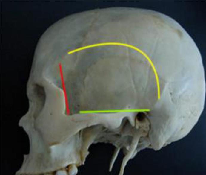 1.сверху и сзади - верхняя височная линия,