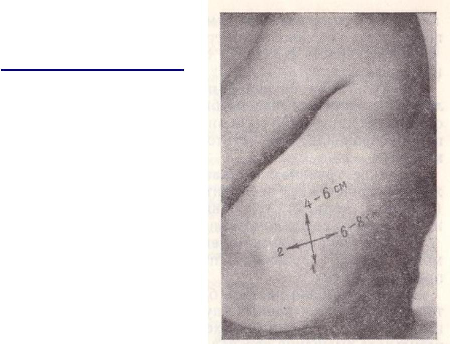 2.Глубокая пальпация одной рукой – печень существенно выступает из под реберной дуги.