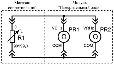 В качестве PR1 использовать мультиметр Mastech MY64 (модуль «Измерительный блок») в режиме измерения сопротивления с пределом измерения до 200 Ом, а PR2 – мультиметр Sanwa PC500 в режиме измерения сопротивления.