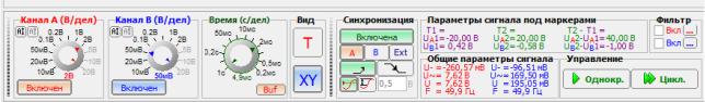 На вкладке «Осциллограф» выбрать режим линейной развертки, нажав кнопку Т. Задать размах шкалы напряжения 2 В/дел. канала А при помощи ручки настройки «Канал A (В/дел.)». Аналогичным образом для канала В установить значение 50 мВ/дел. Задать коэффициент развертки 5 мс/дел. при помощи ручки настройки «Время (с/дел.)» (рис. 5.2).