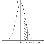 На рис.16 показан график этой функции. Смысл функции (4) заключается в том, что площадь фигуры, заключенной между кривой, осью Δx и двумя ординатами из точек Δx1 и Δx2 (заштрихованная площадь на рис.16) численно равна вероятности, с которой любой отсчет попадет в интервал (Δx1,Δx2) .
