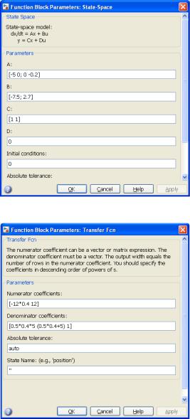 Моделирование выполним по двум вариантам: с использованием блока «передаточная функция» библиотеки Simulink и на основе уравнений состояния динамической системы, записанных в канонической форме. Зададим параметры уравнений состояния в соответствии с рис. 4.1 и параметры блока «передаточная функция» в соответствии с рис. 4.2.