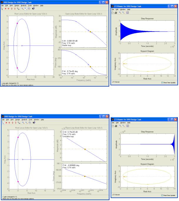 Рисунок 7.2 – Графики ЛАЧХ, ЛФЧХ, корневого годографа, переходной характеристики замкнутого контура и годографа Найквиста разомкнутого контура при k = 13, случай расходящегося переходного процесса