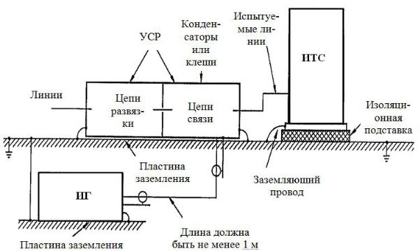 Лабораторная установка, структурная схема которой при испытании на устойчивость к наносекундным импульсным помехам приведена на рис. 4.1, включает в себя следующее испытательное оборудование и устройства: